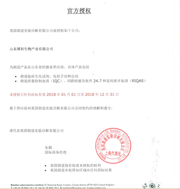 2017年度,博科生物與RANDOX 朗道的合作,取得了非常好的成績。2017年是朗道在中國區改革的第一年,在此過程中憑借朗道優質的產品質量和博科生物優秀的業務及售后團隊,博科生物緊跟國內形勢,順利完成2017年年度銷售額任務。基于雙方良好的合作基礎和銷售成績,英國RANDOX公司將在2018年度延續與博科生物的合作關系。