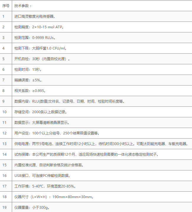 隨機配置:ATP熒光檢測儀(手持)主機、儀器包、掛繩、電池、PC數據線、數據分析軟件、中文操作手冊。